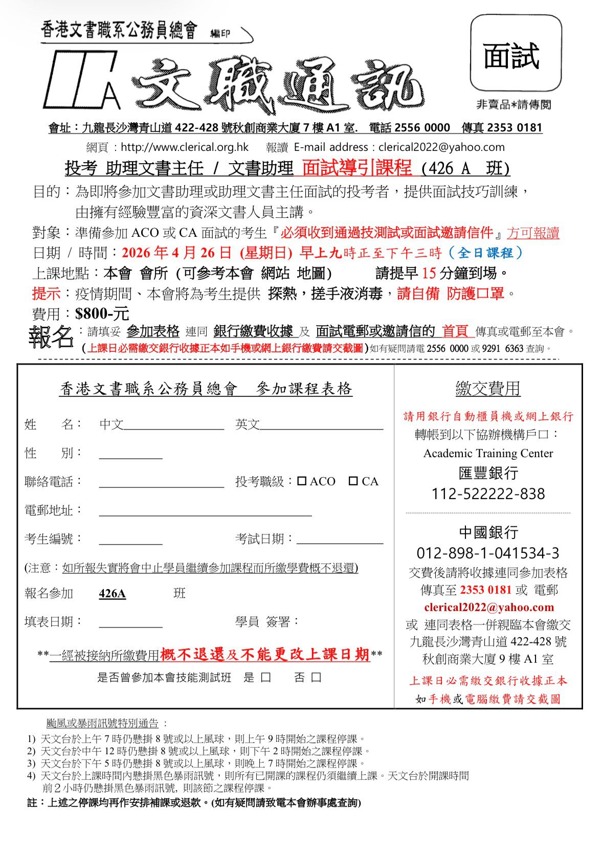 助理文書主任(ACO)/ 文書助理(CA)面試導引課程 (426A班)