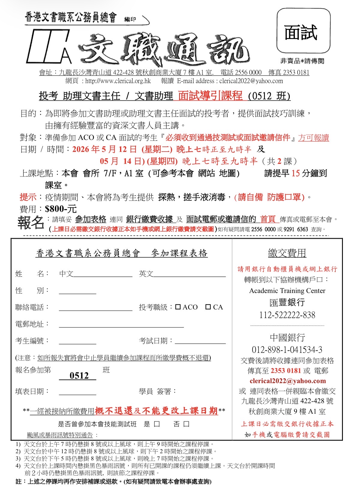 12/5(二) & 14/5(四)(共兩課);特別為即將參加 ACO / CA 面試的投考者,提供面試技巧訓練,唯「必須收到通過技能測試通知或面試電郵邀請函」方可報讀。