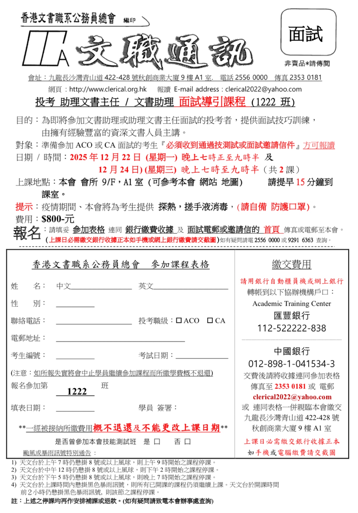22/12(一) & 24/12(三)(共兩課);特別為即將參加 ACO / CA 面試的投考者,提供面試技巧訓練,唯「必須收到通過技能測試通知或面試電郵邀請函」方可報讀。