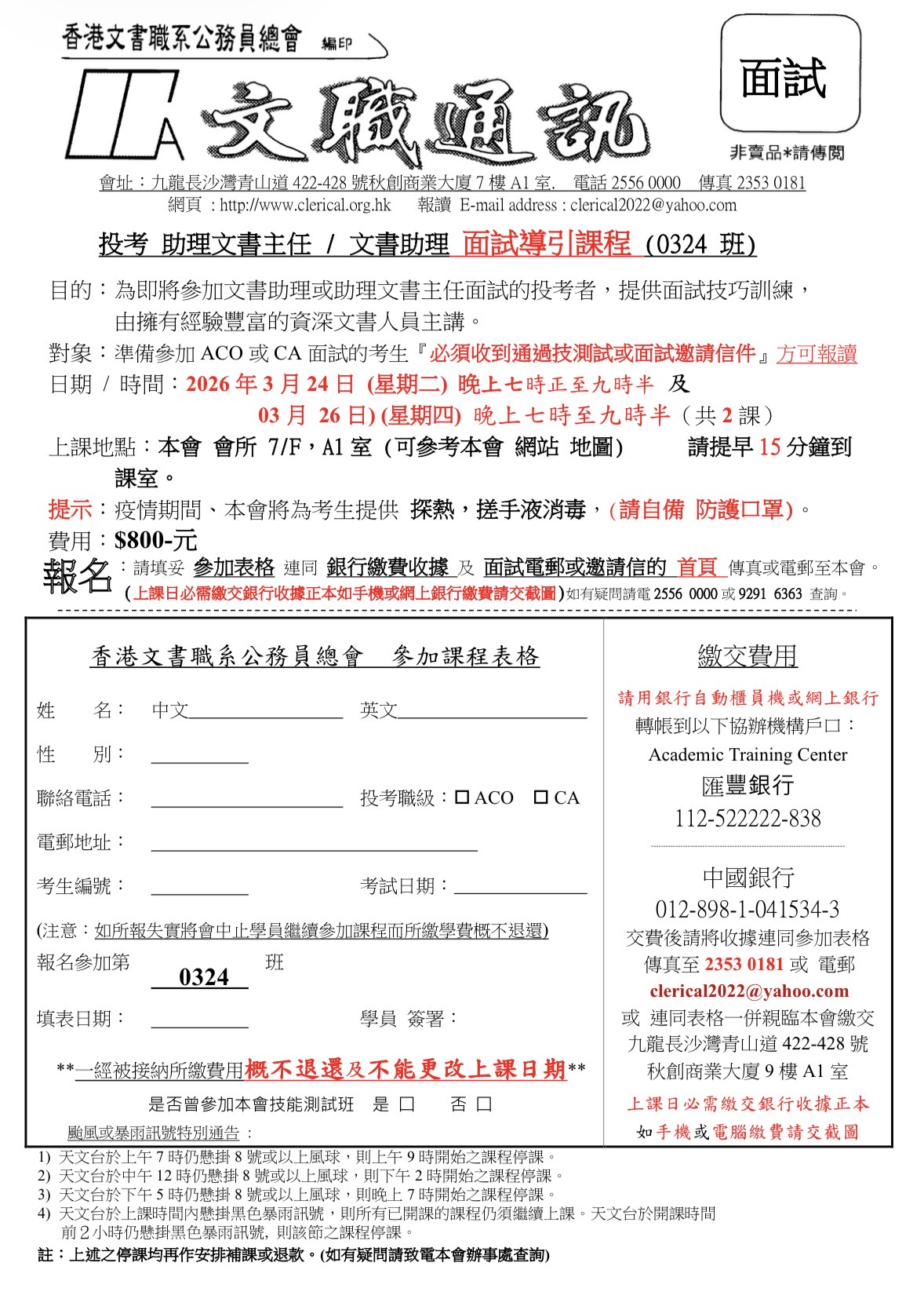 24/3(二) & 26/3(四)(共兩課);特別為即將參加 ACO / CA 面試的投考者,提供面試技巧訓練,唯「必須收到通過技能測試通知或面試電郵邀請函」方可報讀。