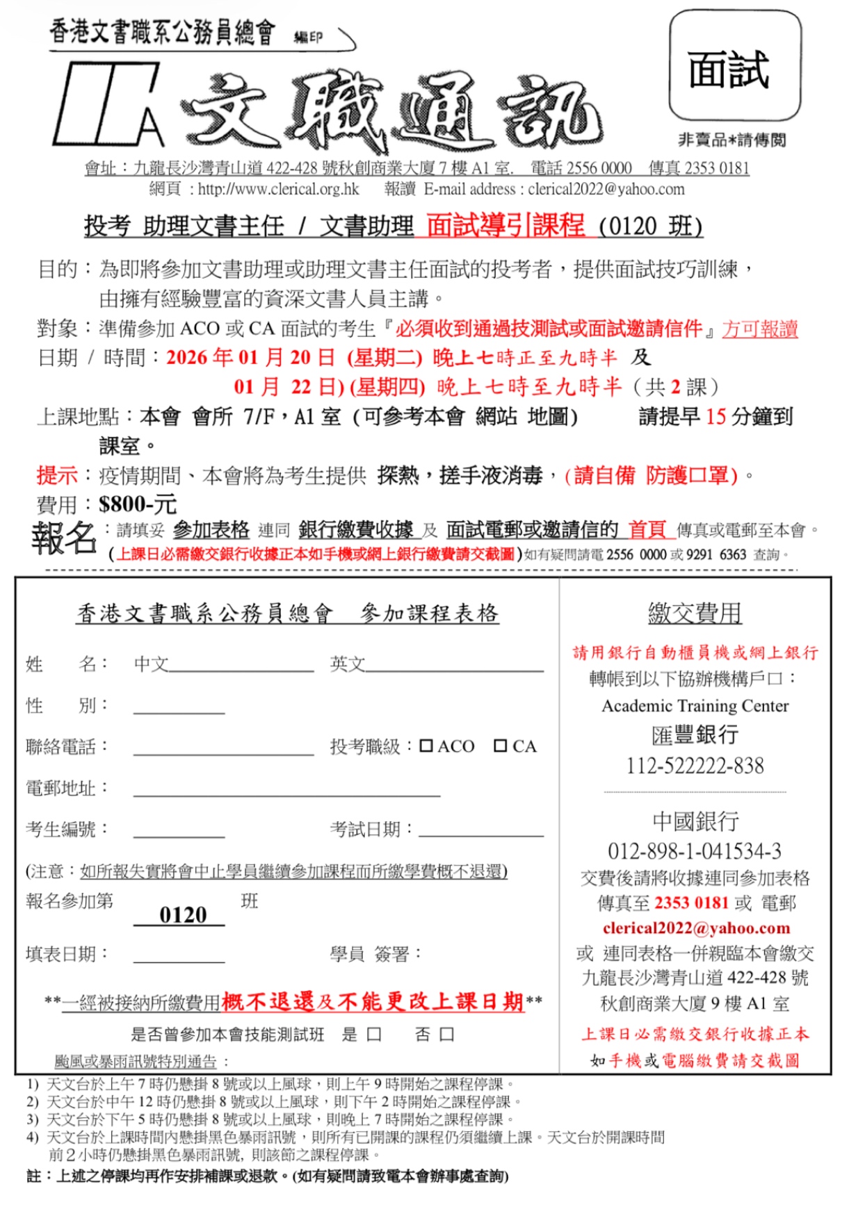 20/1(二) & 22/1(四)(共兩課);特別為即將參加 ACO / CA 面試的投考者,提供面試技巧訓練,唯「必須收到通過技能測試通知或面試電郵邀請函」方可報讀。