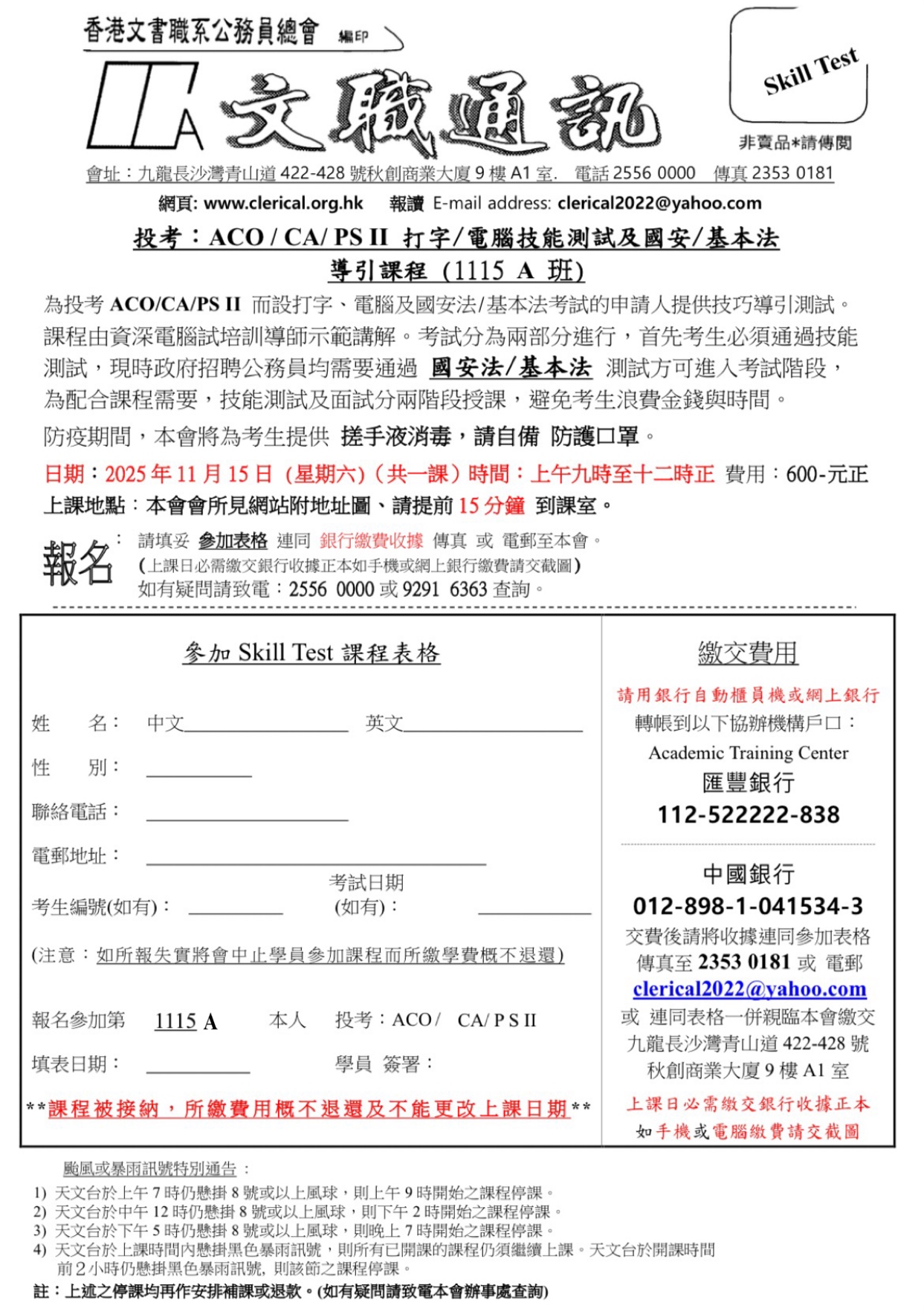 ACO/CA/PS II 打字/電腦技能測試及國安/基本法導引課程(1115A班)